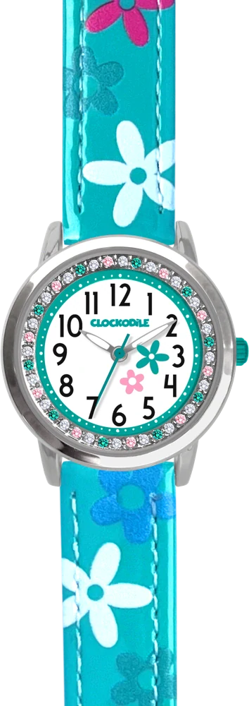 - CLOCKODILE Náramkové tyrkysové dívčí dětské hodinky s kamínky a kytičkami CWG5200