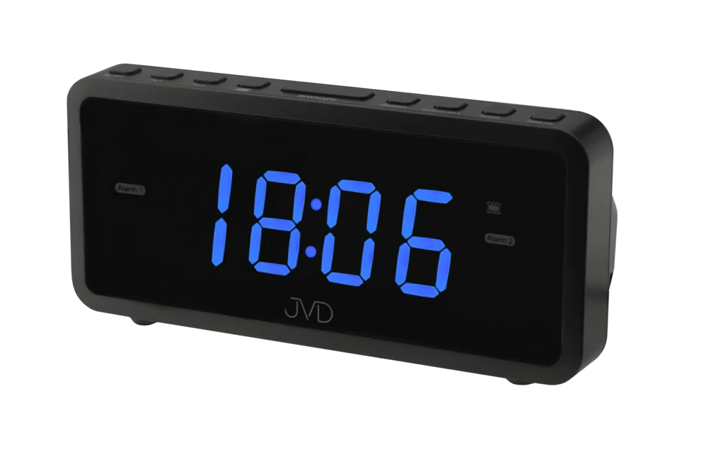 Moderní budík značky JVD do sítě se svítícími číslicemi a opakovaným buzením.