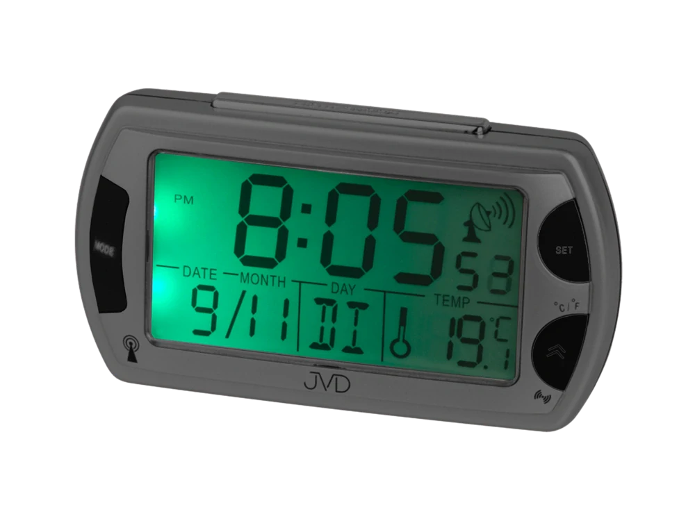 Pomocí tohoto budíku značky JVD budete znát nejpřesnější čas na kontinentu. Přijímá totiž časový signál z Frankfurtu, jehož možná odchylka je menší než 1 sekunda za 2 miliony let!