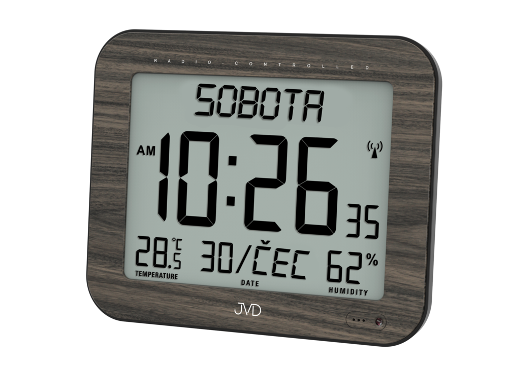Velký LCD displej, novinky v sekci digitálních hodin mají všechny funkce, které člověk potřebuje a nově také inovativní zpracování displeje. Kromě běžného provedení u tohoto modelu nabízíme inverzní displej, kde je tmavé pozadí a čísla naopak bílá. Obě provedení jsou však stjeně dobře čitelná. Všechny čtyři barevné varianty jsou opatřeny senzorem stmívání, díky kterému Vás hodiny ve tme neoslňují. Velkou předností je navíc zobrazení v českém jazyce. Vybírat je možné ze dvou imitací dřeve a dvou jednobarevných vzhledů.- rádiem řízený čas (RC-DCF)