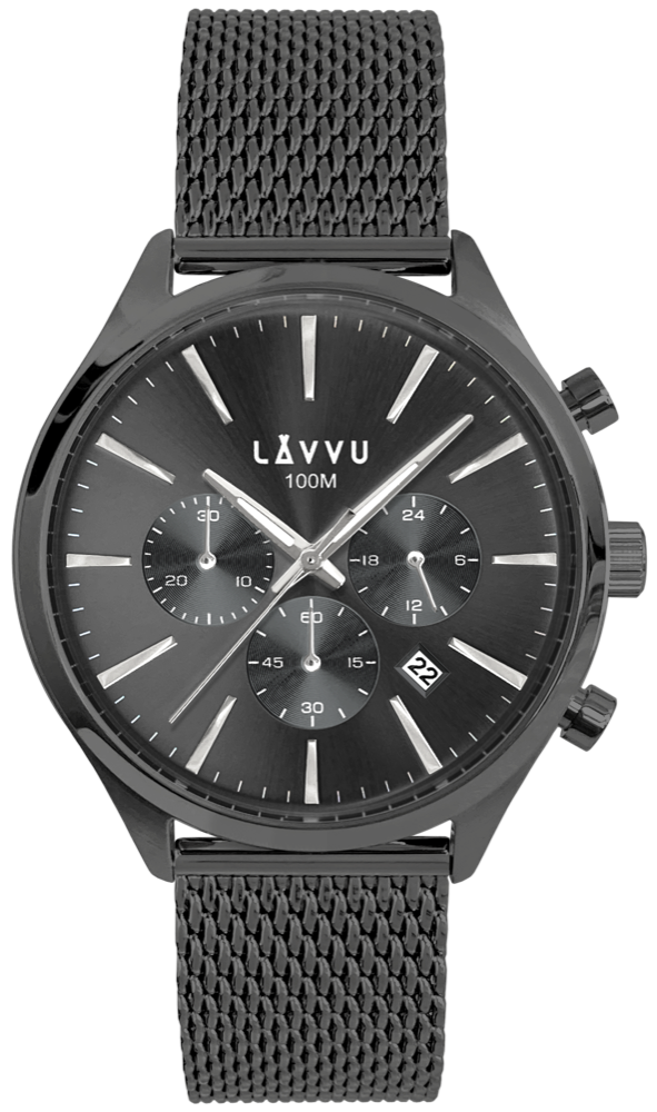 Odolné hodinky značky LAVVU s chronografem, vyrobené z hypoalergenní nerezové oceli. Nadstandardní vodotěsnost 100M, minerální tvrzené sklíčko, ukazatel data a stylový design z nich tvoří spolehlivý doplněk, který bude skvěle vypadat k formálnímu i volnočasovému oblečení. Vyměnitelný řemínek je možné zkrátit a přizpůsobit obvodu ruky.