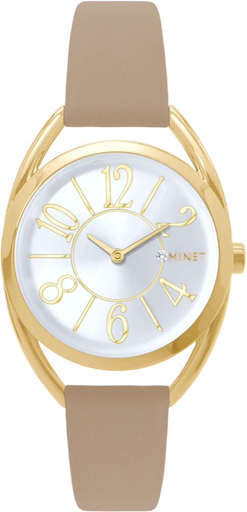 - MINET Stříbrno-zlaté dámské hodinky s čísly ICON GOLD s béžovým koženým řemínkem MWL5248