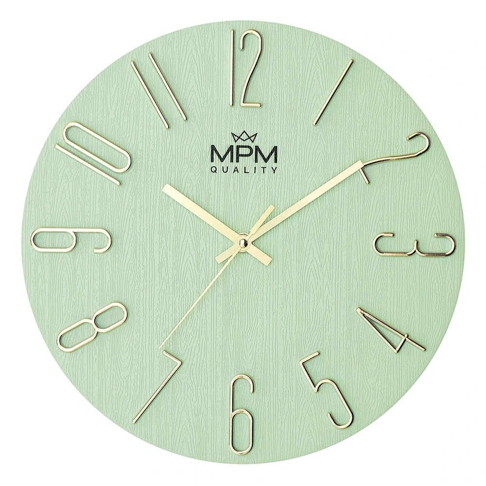 Plastové nástěnné hodiny MPM Primera se vzorem letokruhů v různých barevných odstínech. Ručičky a vystouplé arabské číslice jsou pozlacené a umístěné kolmo ke středu číselníku. Číslice jsou vždy otočeny tak, aby si vždy zachovaly snadnou čitelnost. Hodiny jsou vybaveny strojkem značky Quartz.
