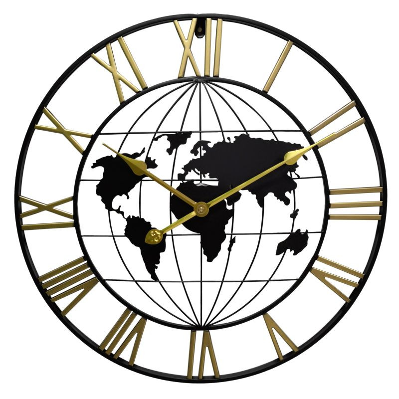 Designové nástěnné kovové hodiny s motivem světa. Římské číslice a ručičky na číselníku hodin jsou pozlacené, ostatní komponenty hodin jsou černé. Hodiny dokonale vyniknou na stěnách domácností i firem, a díky svému motivu světa se skvěle hodí také do interiérů hotelů a cestovních kanceláří.